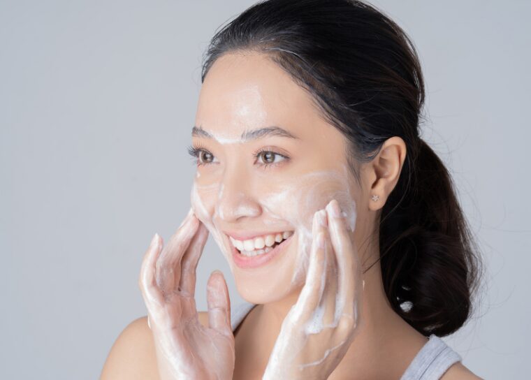 ぬるま湯(32〜34℃程度)で顔を予洗いし、低刺激で弱酸性の洗顔料をしっかりと泡立てます。泡で優しく洗い、こすらず泡を転がすように洗いましょう。洗顔時間は30秒〜1分程度で十分です。CLINIC Wでは、ドクターズコスメの洗顔料やゼオスキンのエクスフォリエーティングポリッシュなど、肌質や症状に合わせた医療機関専売の洗顔料を取り扱っております。