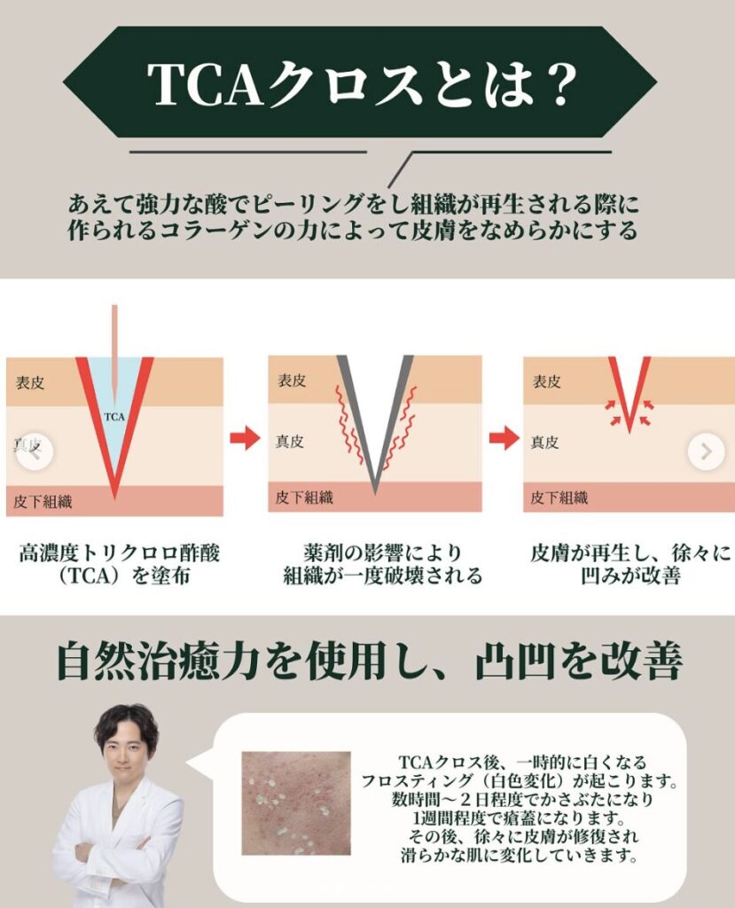 TCAクロスは Trichloroacetic Acid Chemical Reconstruction of Skin Scars の通称です。高濃度のトリクロロ酢酸(TCA)をニキビ跡の凹みに直接塗布し、皮膚の再生を促進する治療法です。特に、アイスピック型やボックスカー型と呼ばれる深いニキビ跡に対して効果が期待できます。