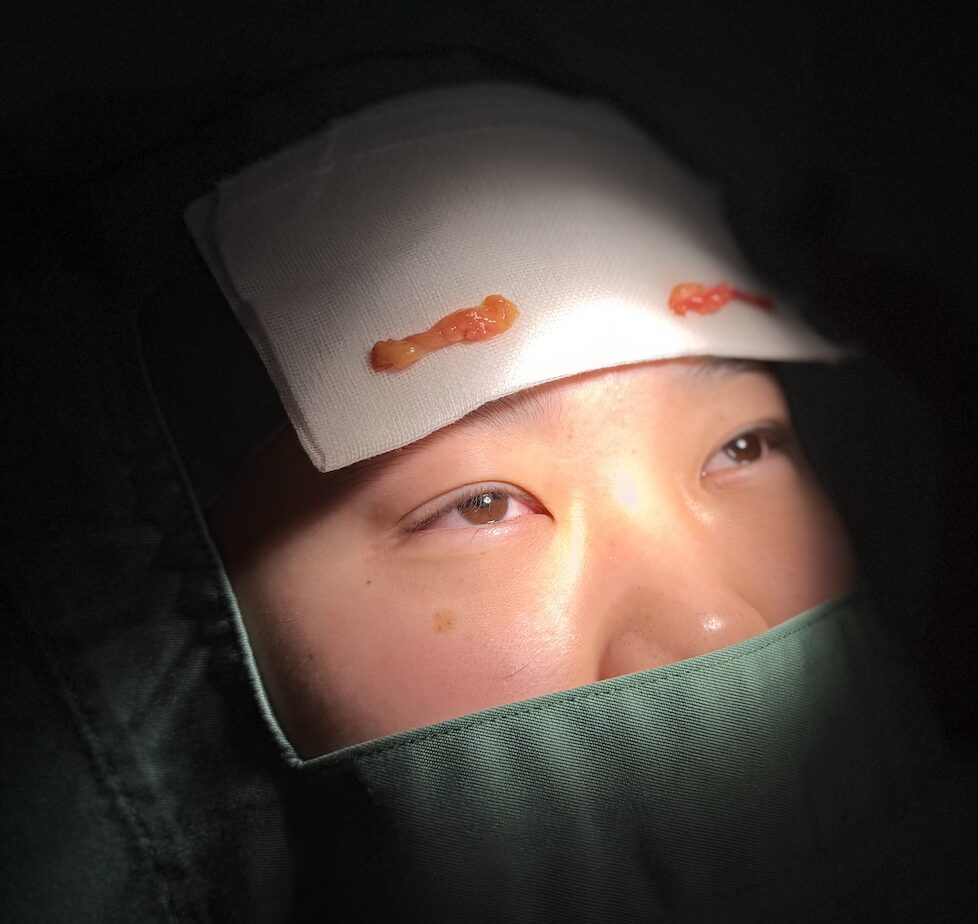笑気麻酔、局所麻酔後にデザインにそって施術していきます。傷はとても小さく、縫合や抜糸の必要はありません。