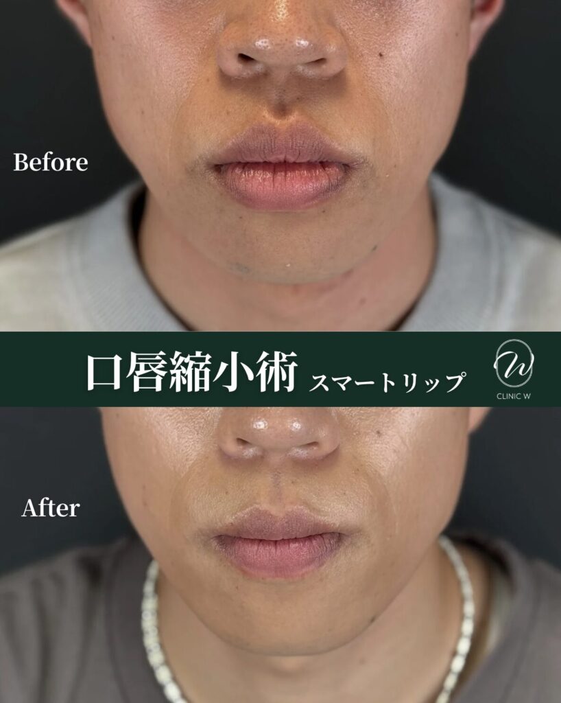 口唇縮小術は、厚みのある唇を薄く整える手術です。唇の内側の粘膜部分(濡れている部分)と乾いている部分の境目付近で、余分な粘膜と粘膜下組織を切除し縫合します。
