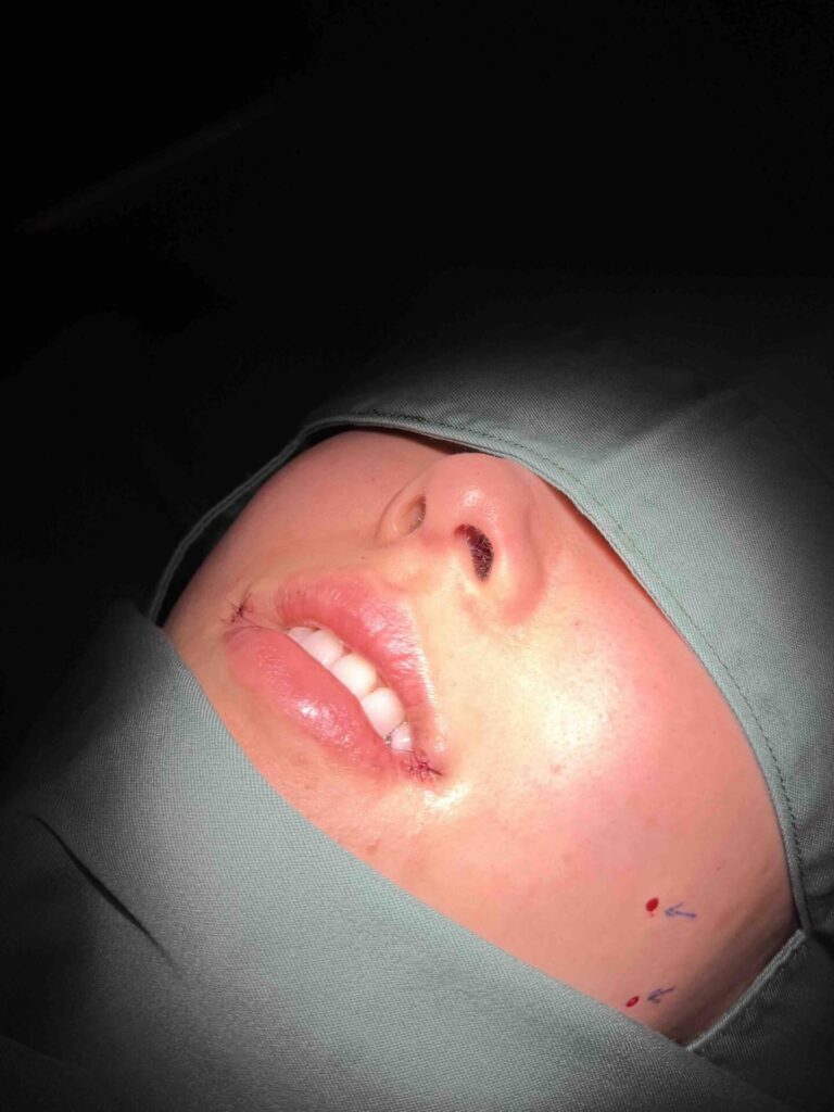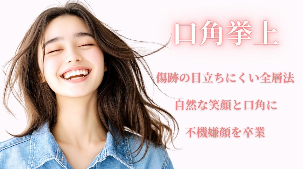 局所麻酔とブロック麻酔後に、口角を切開し、皮下にある筋肉を処理し口角を挙上させます。最後に切開した皮膚を縫合します。