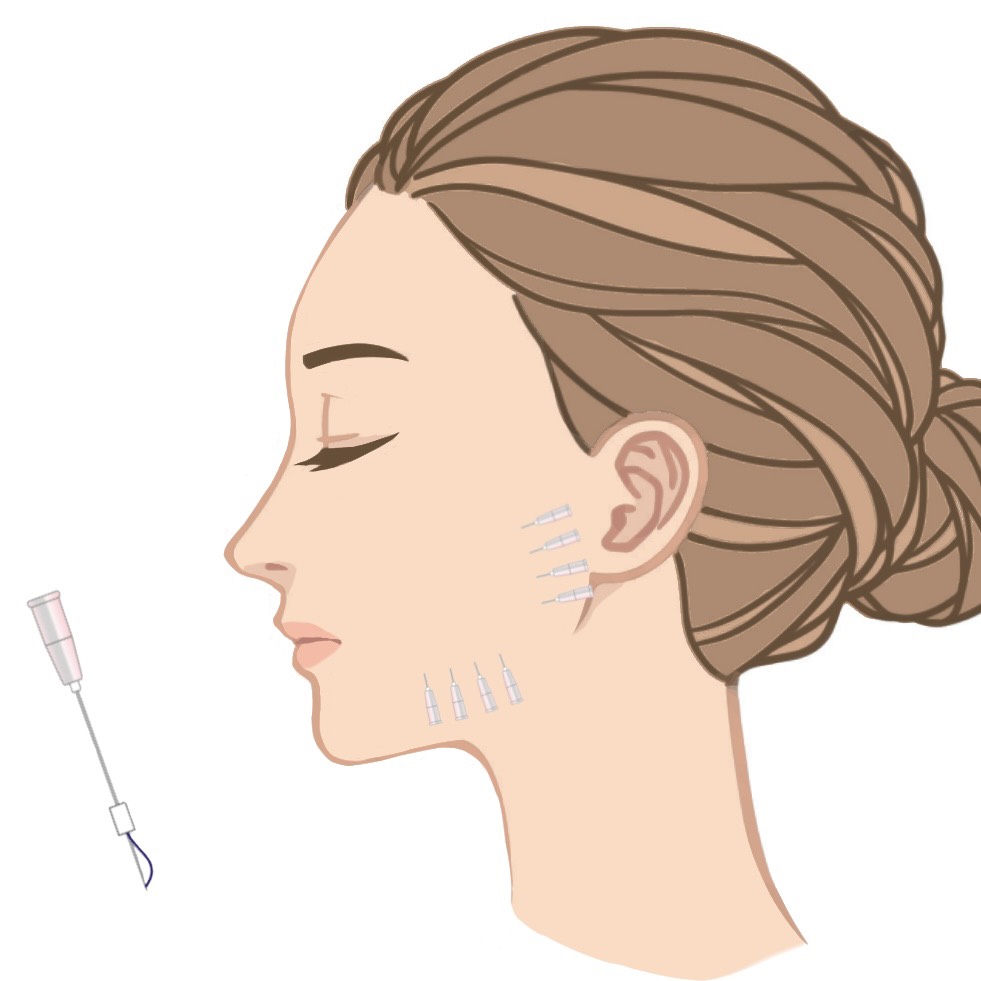 特殊な鍼を皮膚の下に挿入し、その中に内蔵された髪の毛より細い医療用吸収糸を格子状に埋め込みます。腫れやダウンタイムがほぼなく、直後からひきしまりや肌のハリを感じられる即効性が魅力です。皮下にツイストして留まった糸の効果は、約6-8ヶ月かけて吸収される過程でコラーゲン生成をもたらします。これにより、肌質・弾力の向上、引き締め効果によるたるみ・毛穴の改善が期待できます。